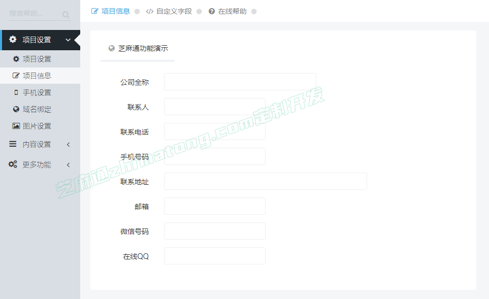 XunRuiCMS安装完成之后,后台没有联系信息的添加地方,可以在设置-项目信息中添加自定义字段来实现如下图的效果: