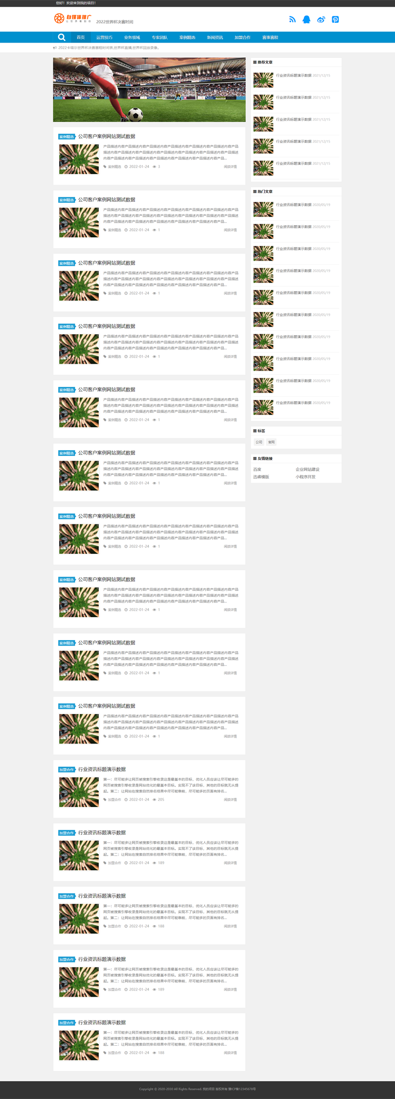 蓝色简洁自适应体育新闻世界杯资讯网站迅睿主题模版下载自适应迅睿主题模版,自动使用移动设备访问,适用于各行业自媒体、资讯类网站XunRuiCMS所用应用TAG关键词库 / tag 温馨提示:demo文件夹为测试数据附带图片,请搭建后及时删除。勿用于商业用途。