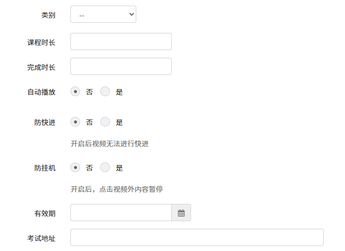 后台可针对每个视频课程,设置是否允许快进,是否允许挂机,有效时间等参数。支持对数据的批量导出。