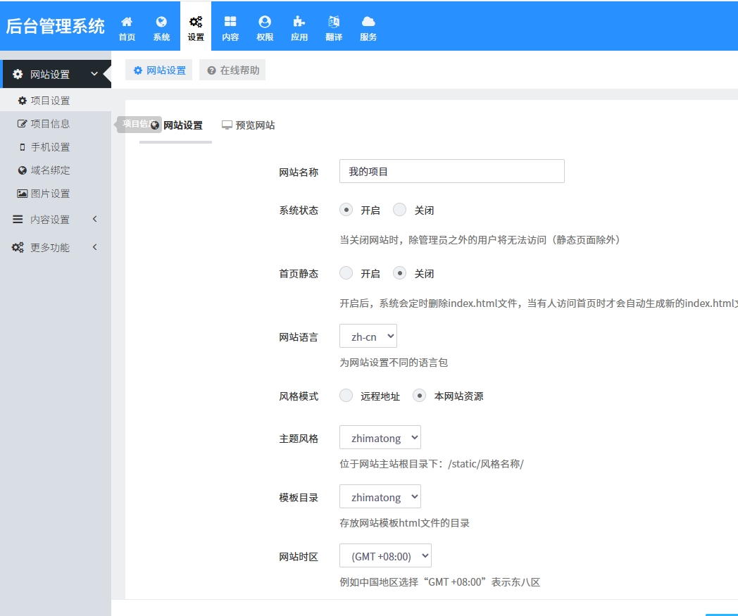 1.打开网站后台,在设置-项目设置中,可以选择主题风格和模板目录;