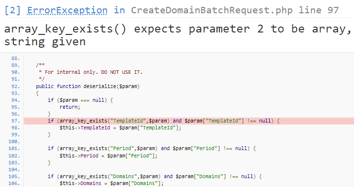 最近在使用腾讯云接口对接功能时,总是报"array_key_exists() expects parameter 2 to be array, string given"