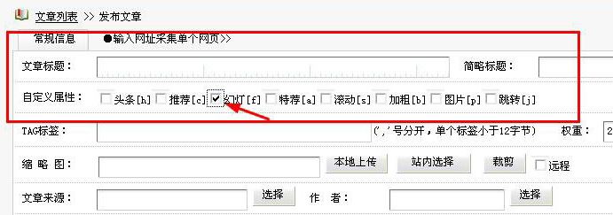 幻灯片调用后台数据的话,都是在添加文章的时候设置的“自定义属性”,除了幻灯这个属性外,还有头条,推荐,加粗,跳转等,不过我们最常用到的主要是推荐和幻灯这两个。
